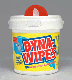 Is Dyna-Wipes Muscle economical? Yes! "Muscle" is very economical when you consider the use of rags and cleaners, plus time saved by having the convenience of a multiple cleaner in one. Your time is valuable too! Are Dyna-Wipes Muscle friendly? Yes! Dyna-WipesMuscle has four skin conditioners, is non-flammable and safe on the skin too. After use, simply discard a s normal paper towel observing general care regarding cleaning products. Are there any recommendations or cautions made when using Dyna-Wipes Muscle? Yes. We recommend pre-testing plastic surfaces for campatibility. Dyna-Wipes Muscle may not be suited ofr certain clear plastics such as plexiglas or styrene. Items such as computer screens, microwaves, VCR's and vehicle instrument panels may be made of these plastics. Do not use on any item with a protective finish, such as brass or finished furniture. Also, after using Dyna-Wipes on floors for spot cleaning or prepping for painting, wash area with mild detergent.