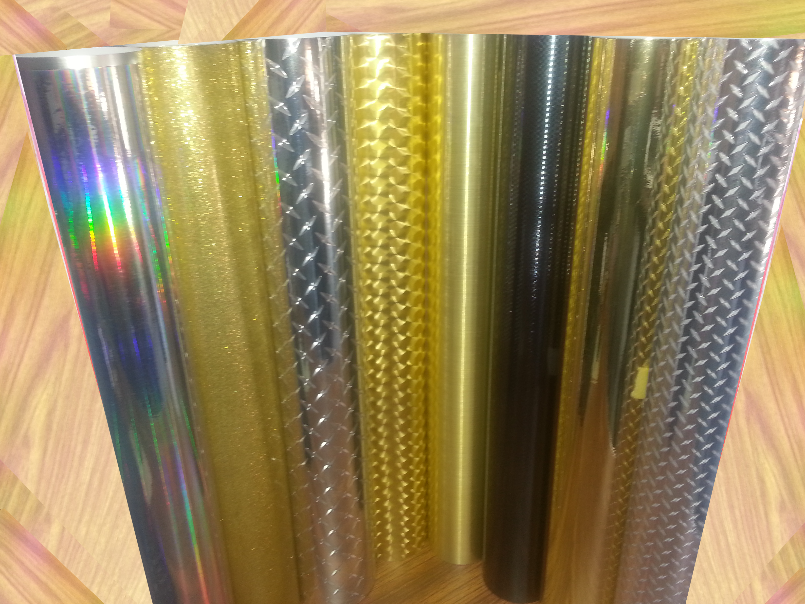 From Left to Right Fantasy Film Rainbow Fantasy Film Holo Glitter Gold Diamond Plate Classic Gold Large Engine Turn Brush Gold Carbon Fiber 1 Gun Metal Gray Poly Gold Diamond Plate Mini |